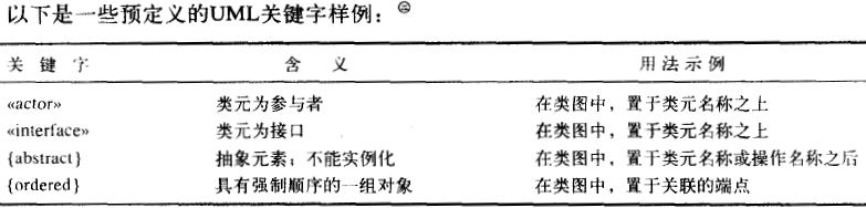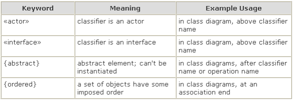 大部分关键字使用<<>>符号表示,但是有些关键词用大括号表示,例如{abstract},这是包含了abstract关键字的约束。一般来说,如果UML元素声称具有“特性字符串”,例如UML操作和UML关联的端点,则其中一些特性字符串将是使用大括号格式的关键字(有些可能是用户定义的术语)
