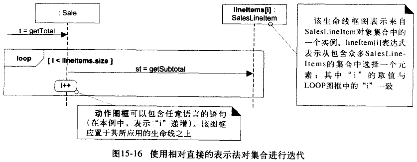 对集合(例如list或map)中所有成员进行迭代的常用算法是向每个成员发送同一条消息 - Often, some kind of iterator object is ultimately used, such as an implementation of java.util.Iterator or a C++ standard library iterator, although in the sequence diagram that low-level “mechanism” need not be shown in the interest of brevity or abstraction.