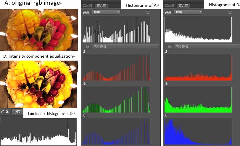 In image D, the mangos are too bright and the strawberries are too dark which hide the detail. This is caused by the uneven distribution of RGB histogram because equalization is on luminance channel of HSI color space.