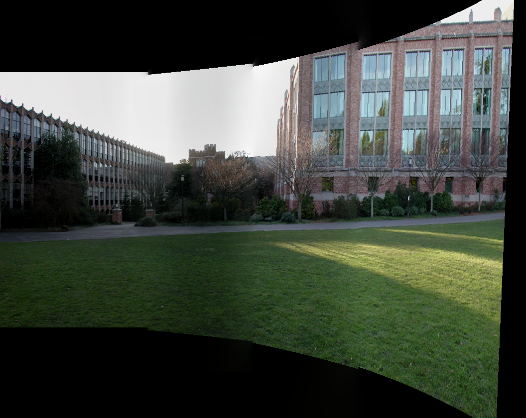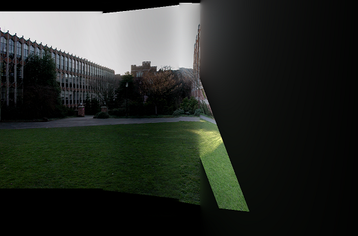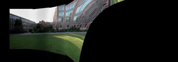 You should also have noticed that the warpped images have cylinder surfaces. The step of warpping images by a cylindrical or spherical projection can effective improve results’ quality. Following is the stitched image without cylidrical projection, which has vertical distortion. Find more about cylindrical panoramas at this page