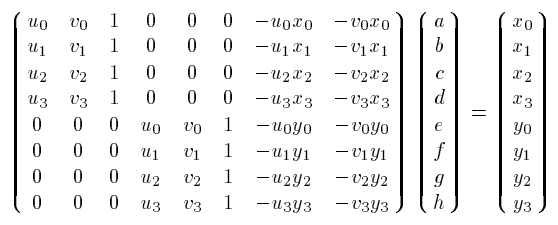 For homography we have $x’=H \times x$ where $x’=[u_i,v_i]$ is a point in the reference image and $x=[x_i,y_i]$ is a point in the image that we want to warp. In order to calculate H we have to solve the following equation: