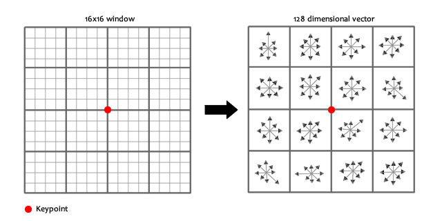 Then, an orientation histogram is used to store the orientation of keypoints and their neighbour regions. The peaks in the histogram correspond to dominant orientations. - Generate SIFT features A 128 dimensions vector is used to represent each keypoint.
