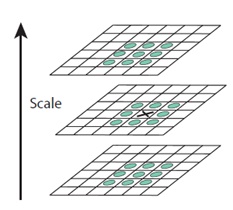 Iterate through each pixel and check its 26 neighbours (if any). In the following figure, X marks the current pixel. The green circles mark the neighbours. They distribute in three consecutive scales (one octave). Mark maxima and minima.
