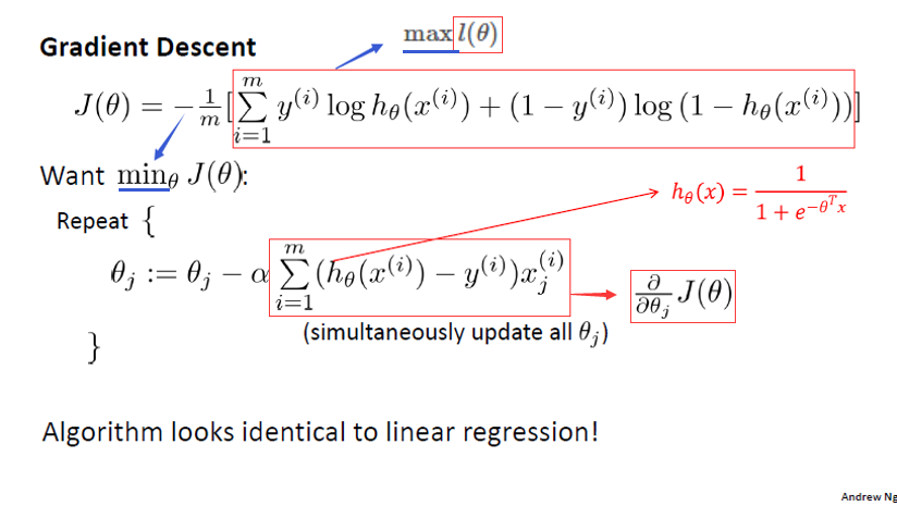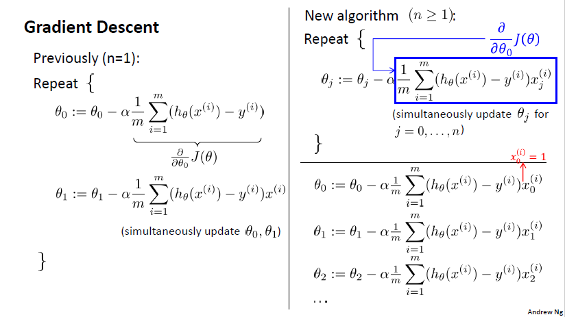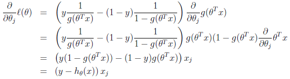 图一中的偏导数进一步计算(此处省略计算过程)得到$\frac{ \partial }{ \partial y }J(\theta)=\frac{1}{m}\displaystyle \sum_{ i = 1 }^{ m } (h_\theta(x^{(i)})-y^{(i)})x_j^{(i)}$,即下图
