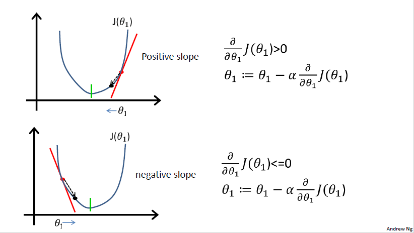 图中的$\frac{ \partial }{ \partial \theta_j }J(\theta)$是偏导数(partial derivative),Positive slope表示切线斜率(slope of the tangent)为正(反之为负),它们和梯度(gradient)的关系是