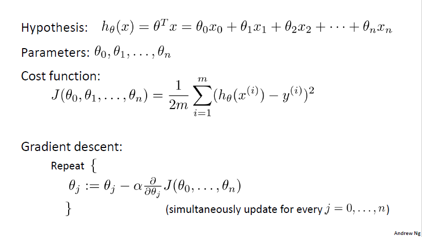 $$J(\theta_0,\theta_1,…,\theta_n)=\frac{1}{2m}\displaystyle \sum_{ i = 1 }^{ m } (h_\theta(x^{(i)})-y^{(i)})^2$$
