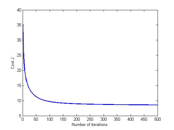 初始化。alpha及num_iters的值需根据不同的数据调整。本例中alpha=0.1-0.001可以较理想的速度收敛,num_iters=50000后收敛到局部极小值,难以再减小。下面减少迭代次数为500用于快速获得结果进行观察。