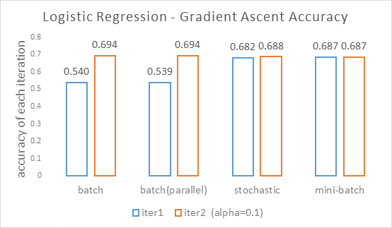 上图是设$\alpha=0.1$设各方法迭代两次统计的准确率,准确率的计算方法是预测值大于等于0且标签为1或预测值小于0且标签为0时预测正确。该学习率设置得较大是为了使在两次迭代(节省运行时间)情况下就可以看出准确率的变化。
