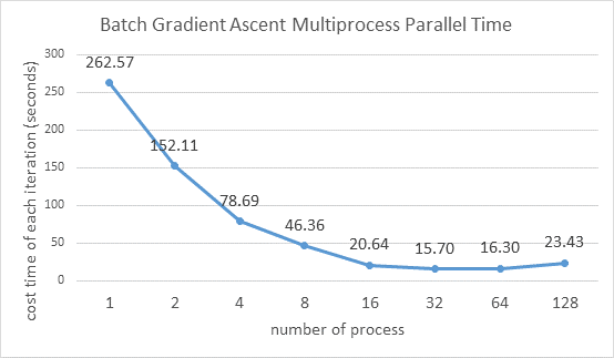 - 进程数较多时,每个进程计算梯度的用时很小,那些用于构建并行化操作的基础用时(如start、join、lock)在总用时中的比重变大,变得可见。